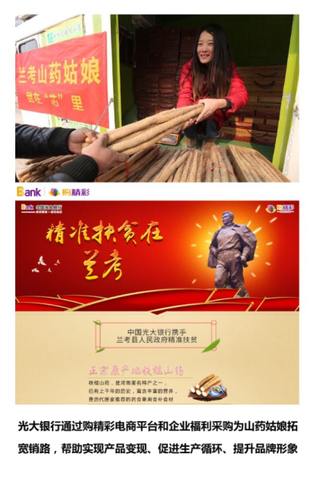 去年11月,中國光大銀行在河南省蘭考縣實地調(diào)研時,了解到潘春婷的創(chuàng)業(yè)歷程、經(jīng)營情況以及創(chuàng)業(yè)困難后,決定幫助她打開外部市場,拓展線上銷售渠道,將“山藥姑娘”的“潘根記”無公害鐵棍山藥引入光大購精彩商城特設(shè)的“精準(zhǔn)扶貧在蘭考”欄目,通過微信、商城等廣泛宣傳向客戶和員工推介。短短一個月時間,光大銀行為“山藥姑娘”帶來40余萬元銷售額,潘春婷得以償還前期貸款,并購入了用于儲存山藥的冷庫,實現(xiàn)了產(chǎn)品變現(xiàn)、促進(jìn)了生產(chǎn)循環(huán)、提升了品牌形象。