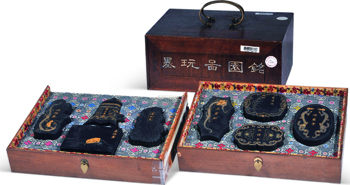 “研濡生香”此次匯集筆、墨、紙、硯文房四寶,另有印章及文房諸器。這其中仍以硯為主,匯集端、歙等各類硯材,有以佳材取勝者,亦有文人硯以供選藏。在此基礎(chǔ)上,此次著力提高了其他文房用器的品質(zhì)。墨類中以“清嘉慶御制銘園圖墨八方”尤為突出,同時為瑪麗及莊智博舊藏,遞藏清晰。同時,還有一批日本同一私人收藏紙箋,其中包括紅地描金箋紙、夾刻箋及虎皮宣等諸多類別,均為藏家20世紀(jì)六、七十年代購自榮寶齋。印章類中,“潘天壽自用田黃長方印”印料考究,紋理清晰,十分難得。文房諸器中包括銅、竹、木等諸多類別,其中“清早期銅灑金鋪首尊”體量碩大,灑金亮麗自然,款識挺立。