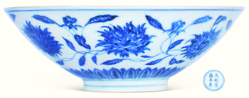 明宣德內(nèi)模印外青花纏枝蓮紋斗笠碗 |
