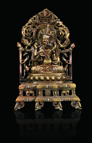 “玉器工藝品”專場中,以玉器開場,甄選牌、佩、山子、爐、屏等不同玉質(zhì),各式器型的拍品,以供選藏。其中“清乾隆白玉留皮朝冠耳獸足爐”尤為突出,玉質(zhì)瑩潤,玉色潔白,選料較大,掏膛爽利,加之獸足寥寥數(shù)刀,生動逼真,頗為添色。佛教藝術(shù)品一類亦是本專場的重點,其中不同時期的金銅造像,即有宮廷風(fēng)格,又有西藏風(fēng)格等。其中“清乾隆銅鎏金財寶天王像”為乾隆宮廷造像,鑄造生動,鏨刻清晰,實為藏奉首選。另外,“清乾隆合金銅白上樂金剛像”亦十分突出,反映了乾隆宮廷在佛造像中的慕古風(fēng)格,表現(xiàn)出清廷對于西藏所供古代風(fēng)格造像的推崇,作品遵循經(jīng)典的印度樣式,寶座及背光均頗具特色。