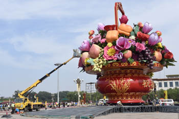 ??? 9月24日,工人在布置天安門廣場“祝福祖國”巨型花籃。當日,天安門廣場“祝福祖國”巨型花籃基本布置完畢。今年的大花籃以喜慶的“花果籃”為主景,籃內擺放柿子、石榴、蘋果及牡丹、玉蘭、月季等仿真花果,寓意十八大以來我國在各領域取得的輝煌成就。大花籃頂高17米、籃體高15.3米,底部花壇采用心形圖案,直徑達50米。籃體南側有“祝福祖國,1949-2017”、北側有“喜迎十九大”字樣。從2011年開始,“祝福祖國”巨型花籃就一直作為廣場中心花壇,在國慶節(jié)期間向祖國獻禮。記者 羅曉光 攝 |