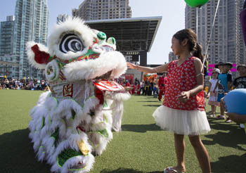 ??? 9月24日,在加拿大安大略省米西索加市,一名小女孩在“龍獅節(jié)”上與一只舞獅互動。加拿大首屆“龍獅節(jié)”24日在米西索加舉行,有數(shù)十支舞龍和舞獅團隊參加。新華社發(fā)(鄒崢 攝) |