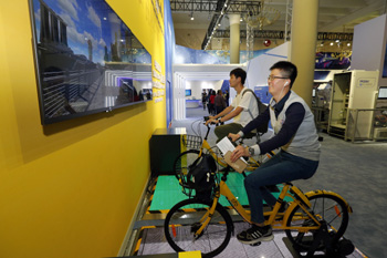 ??? 9月26日,參觀者在體驗共享單車互動騎行。當日,在北京展覽館舉行的“砥礪奮進的五年”大型成就展正式面向公眾開放,展覽中的多種互動體驗式展區(qū)、展品吸引眾多參觀者參觀。記者 沈伯韓 攝 |