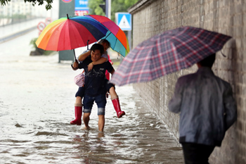 ??? 9月25日,在江蘇省常州市街頭,行人走過積水路段。當日上午,江蘇省氣象臺發(fā)布暴雨橙色預警信號,南京中北部、淮安南部、常州、鎮(zhèn)江、無錫等地出現(xiàn)連續(xù)3小時50毫米降水,交通出行受到明顯影響。新華社發(fā)(陳暐 攝) |