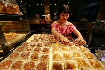 ??? 9月23日,四川省遂寧市一家糕點店的員工在擺放月餅。中秋佳節(jié)臨近,各地月餅飄香上市。新華社發(fā)(鐘敏 攝) |
