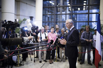 ??? 法國鐵路設備制造商阿爾斯通與德國西門子公司9月26日發(fā)表聯(lián)合公報說,兩家公司已就鐵路業(yè)務的合并達成協(xié)議。圖為法國經(jīng)濟部長勒梅爾出席新聞發(fā)布會對合并表示支持。新華社/美聯(lián) |
