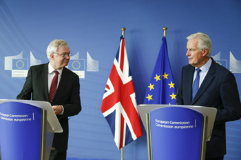 ??? 9月25日,在比利時首都布魯塞爾,歐盟首席談判代表巴尼耶(右)與英國“脫歐”事務大臣戴維·戴維斯出席記者會。歐盟與英國25日在布魯塞爾啟動第四輪“脫歐”談判,巴尼耶呼吁英方在“脫歐”談判中能更“清晰”。與以往三輪談判一樣,此輪談判為期4天,雙方繼續(xù)就公民權利、“‘脫歐’賬單”、北愛爾蘭邊界等議題進行討價還價。記者 葉平凡 攝 |