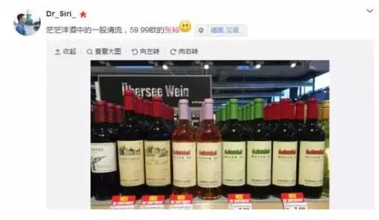 不久前,有位朋友在微博 po 圖稱(chēng)在德國(guó)漢諾威的超市中偶遇張?jiān)F咸丫疲€配文:“茫茫洋酒中的一股清流”。