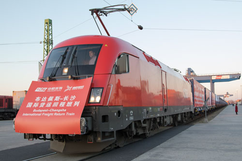 11月27日,布達(dá)佩斯至長(zhǎng)沙國(guó)際貨運(yùn)回程班列首發(fā)儀式在匈牙利首都布達(dá)佩斯舉行,這標(biāo)志著布達(dá)佩斯至長(zhǎng)沙的中歐班列回程線路正式開通。 新華社發(fā)(弗爾季·奧蒂洛 攝)