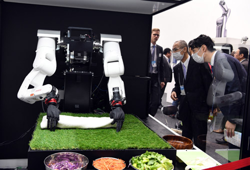 2017國(guó)際機(jī)器人展覽11月29日在日本東京開幕。圖為機(jī)器人表演疊毛巾。記者 馬平 攝