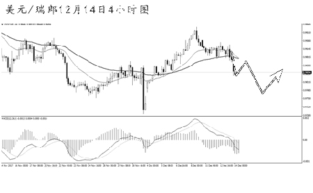 ▲美元兌瑞郎小幅反彈后再度發(fā)起下調(diào)。經(jīng)過短線的下調(diào),MACD重新進入到空頭動能充盈的階段。短線下調(diào)力度迅猛但幅度有限,可謹慎看空,但需隨時謹防匯價重新發(fā)起上攻風(fēng)險。
