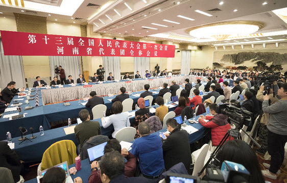3月6日,十三屆全國(guó)人大一次會(huì)議河南代表團(tuán)全體會(huì)議向媒體開(kāi)放。新華社記者 丁海濤 攝