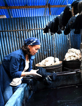 (左圖)4月12日,楊成蘭用傳統(tǒng)植物染料染紗。(上圖)4月12日,吳方俊(左)、楊成蘭夫婦在查看剛?cè)镜亩弊逋敛肌?/p>