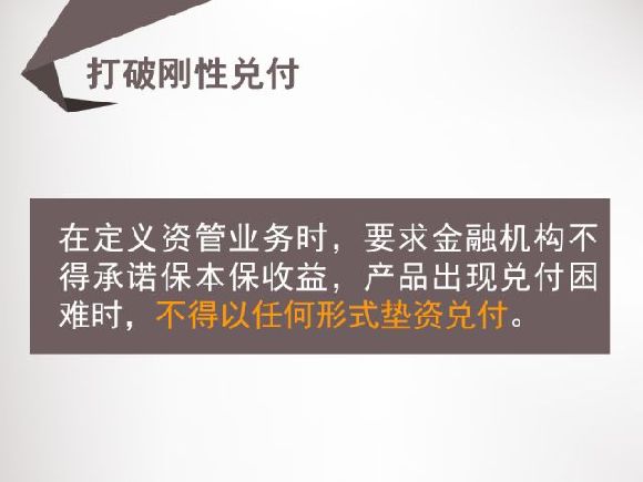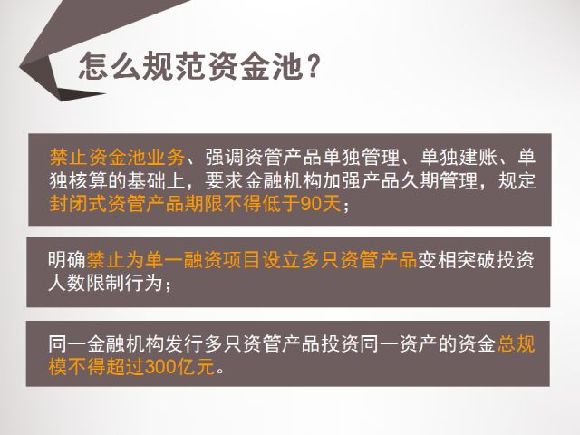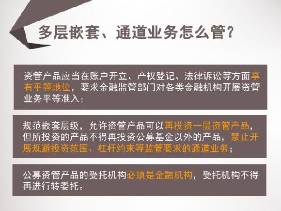 該負(fù)責(zé)人說(shuō),資管新規(guī)的總體思路是按照資管產(chǎn)品的類(lèi)型制定統(tǒng)一的監(jiān)管標(biāo)準(zhǔn),對(duì)同類(lèi)資管業(yè)務(wù)作出一致性規(guī)定,實(shí)行公平的市場(chǎng)準(zhǔn)入和監(jiān)管,最大程度地消除監(jiān)管套利空間,為資管業(yè)務(wù)健康發(fā)展創(chuàng)造良好的制度環(huán)境。