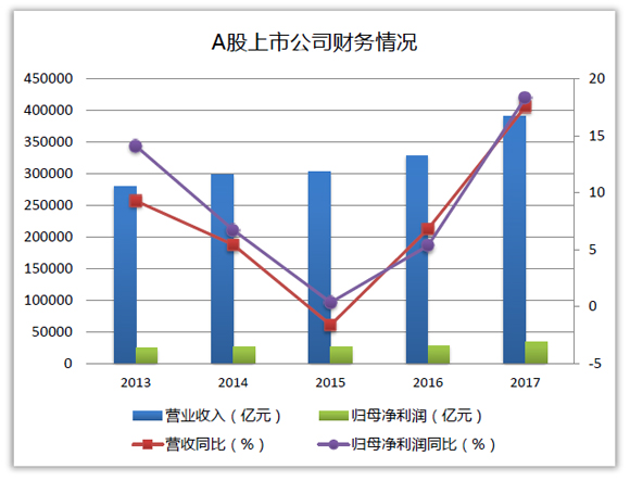 4月末,A股上市公司2017年年報(bào)披露結(jié)束。Wind統(tǒng)計(jì)數(shù)據(jù)顯示,2017年,A股上市公司的營收、凈利潤(rùn)同比都有較大幅度上升。截至2017年12月,A股上市公司共3467家,實(shí)現(xiàn)營業(yè)收入38.96萬億元,同比增加17.2%,歸母凈利潤(rùn)3.35萬億元,同比增18.3%,歸母凈利潤(rùn)增速高于營業(yè)收入增速。滬深兩市公司在經(jīng)濟(jì)發(fā)展的韌性、結(jié)構(gòu)優(yōu)化、新動(dòng)能等方面呈現(xiàn)出多個(gè)新亮點(diǎn),高質(zhì)量發(fā)展的趨勢(shì)正在形成。