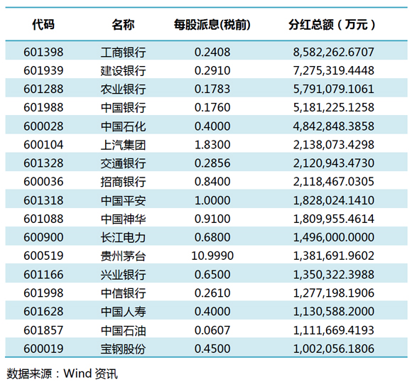 從分紅的總金額來看,計(jì)劃分紅超百億的公司共有17家,均出自上交所,且均為“百億俱樂部”的成員,其中,工商銀行以 858.23億元排在第一位;而從每股派息金額來看,貴州茅臺(tái)以10.9990元高居第一位,不過當(dāng)前茅臺(tái)的股價(jià)也是遠(yuǎn)遠(yuǎn)高于其它個(gè)股。