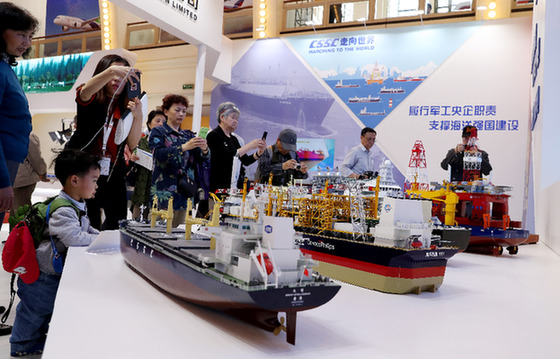 5月10日,參觀者在中國(guó)船舶工業(yè)集團(tuán)展位前觀看我國(guó)設(shè)計(jì)建造的船舶模型。記者 方喆 攝