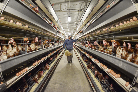 經(jīng)過數(shù)道“關卡”消毒,記者才進入蛋雞養(yǎng)殖區(qū)域,看到所有雞舍均經(jīng)過密閉化處理,與外界人員嚴格隔離,雞舍內(nèi)采用德國進口智能化飼養(yǎng)設備,并有自動調(diào)控溫度、濕度、空氣的內(nèi)控系統(tǒng)。3條自動傳送帶將雞蛋、雞糞、飼料分離傳送,自動化蛋品揀選設備對每一枚雞蛋進行檢測、殺菌、噴碼和分級處理,雞糞則通過地下輸糞帶送入發(fā)酵處理系統(tǒng)。