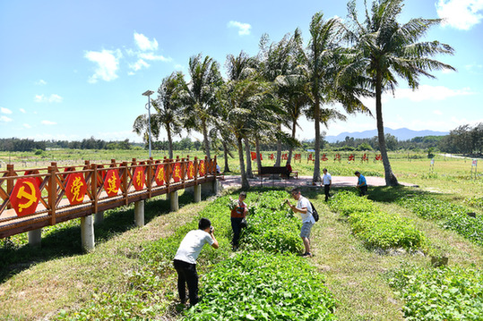 游客在萬(wàn)寧市大石嶺村共享菜園里采摘 記者 李鑫 攝