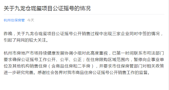 杭州住保房管公眾號26日發(fā)布消息稱,25日晚,關(guān)于九龍倉瓏璽項目公證搖號公開銷售過程中出現(xiàn)三家企業(yè)同時中簽的情況,引起了網(wǎng)民的較大關(guān)注。