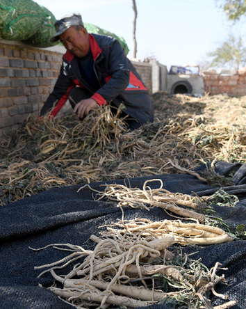 現(xiàn)在,右玉縣土壤肥力足,成了種藥材的好地方。村民張建平掰斷一截板藍(lán)根,指給記者看:“中間的芯是黃色的,上好的品相。收購公司的人說地里肥力足,才能種出好板藍(lán)根。”