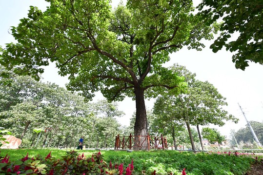 在河南蘭考縣焦裕祿干部學(xué)院門口,游客從“焦桐”下走過。記者 馮大鵬 攝