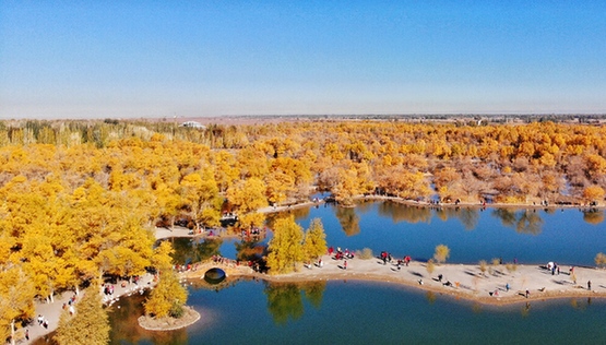 游客在甘肅金塔沙漠胡楊林景區(qū)賞秋。記者 張睿 攝