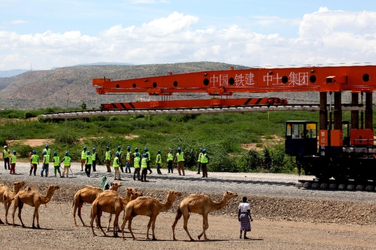 圖為2014年4月27日中國(guó)鐵建中土集團(tuán)的工人在埃塞俄比亞德雷達(dá)瓦進(jìn)行亞吉鐵路先期鋪軌作業(yè)的資料照片。新華社發(fā)(劉渝 攝)