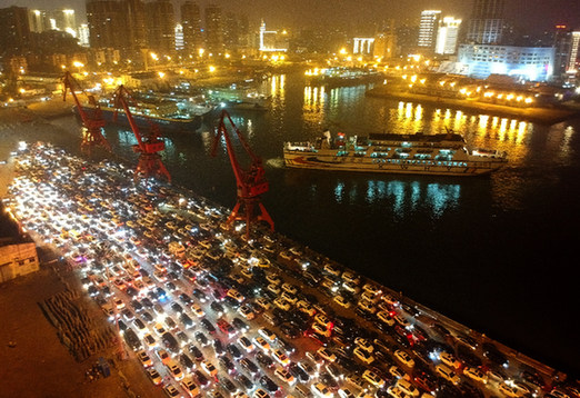 2月21日,在海口市秀英港,大量滯留車輛等待過(guò)海前往廣東。記者 趙穎全 攝