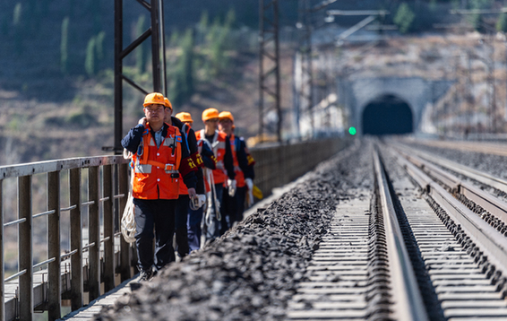 圖為六盤水工電段的橋隧工人在天生橋特大橋橋面進(jìn)行巡檢。