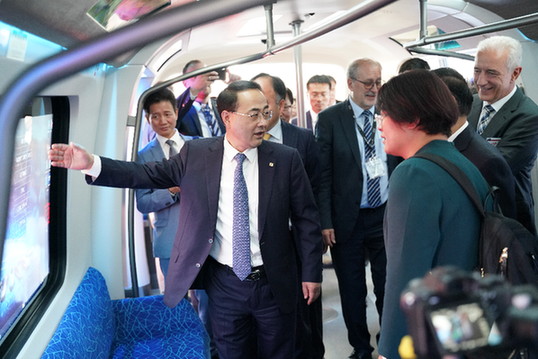 孫永才在德國柏林向外賓介紹中國中車最新研制的碳纖維地鐵列車。資料照片