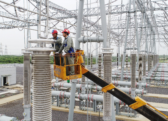 近日,在武漢市東湖高新區(qū)龍泉街,國網湖北送變電工程有限公司施工人員在檢查鳳凰山變電站設備。記者 肖藝九 攝