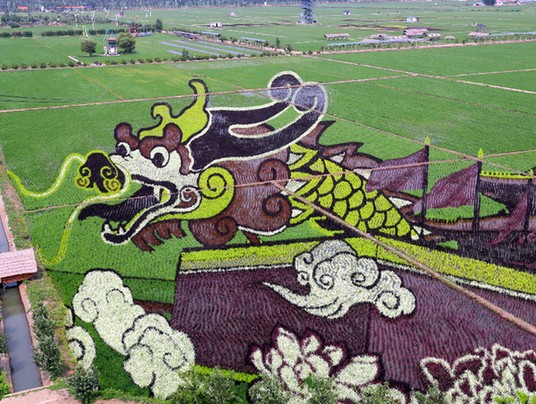 沈陽興隆臺錫伯族鎮(zhèn)錫伯龍地創(chuàng)意農業(yè)產業(yè)園的稻田畫《我愛你中國》。記者 楊青 攝