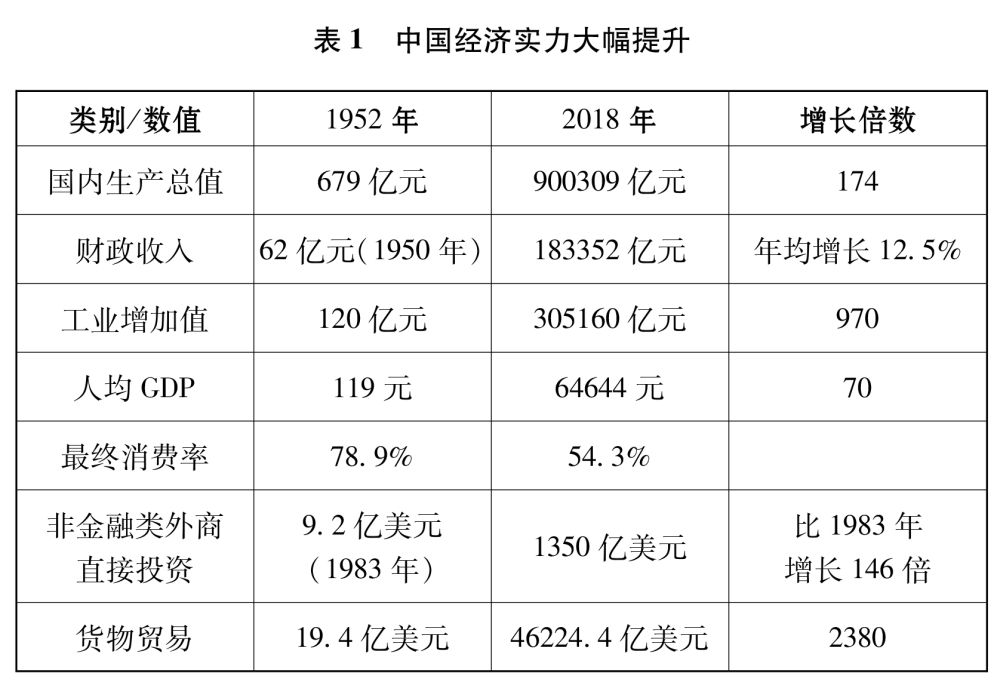 經(jīng)濟(jì)實(shí)力顯著增強(qiáng)。從1952年至2018年,中國(guó)工業(yè)增加值從120億元增加到305160億元,按不變價(jià)格計(jì)算增長(zhǎng)970倍,年均增長(zhǎng)11%;國(guó)內(nèi)生產(chǎn)總值從679億元增加到90萬(wàn)億元,按不變價(jià)計(jì)算增長(zhǎng)174倍,年均增長(zhǎng)8.1%;人均國(guó)內(nèi)生產(chǎn)總值從119元增加到2018年的64644元,按不變價(jià)計(jì)算增長(zhǎng)70倍。根據(jù)世界銀行數(shù)據(jù),按市場(chǎng)匯率計(jì)算,2018年中國(guó)經(jīng)濟(jì)規(guī)模為13.6萬(wàn)億美元,僅次于美國(guó)的20.5萬(wàn)億美元。目前,中國(guó)是世界上唯一擁有聯(lián)合國(guó)產(chǎn)業(yè)分類目錄中所有工業(yè)門類的國(guó)家,多項(xiàng)工業(yè)品產(chǎn)量居世界第一。科技發(fā)展成就顯著,“兩彈一星”、載人航天、超級(jí)雜交水稻、高性能計(jì)算機(jī)、人工合成牛胰島素、青蒿素、高速鐵路等重大科技成果,為經(jīng)濟(jì)社會(huì)發(fā)展提供了有力支撐。對(duì)外貿(mào)易持續(xù)增加,2009年中國(guó)成為全球最大貨物出口國(guó)、第二大貨物進(jìn)口國(guó),2013年成為全球貨物貿(mào)易第一大國(guó)。改革開放以來(lái),中國(guó)引進(jìn)外資大幅增加,日益成為吸引全球投資熱土。中國(guó)已經(jīng)成為世界第二大經(jīng)濟(jì)體、制造業(yè)第一大國(guó)、貨物貿(mào)易第一大國(guó)、商品消費(fèi)第二大國(guó)、外資流入第二大國(guó)、外匯儲(chǔ)備第一大國(guó)(表1)。