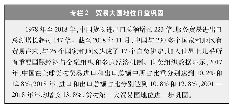 大規(guī)模“請(qǐng)進(jìn)來(lái)”。打開大門的中國(guó)充滿生機(jī)與活力,國(guó)際社會(huì)看好中國(guó)發(fā)展,越來(lái)越多的國(guó)家與中國(guó)開展合作,越來(lái)越多的外國(guó)企業(yè)來(lái)中國(guó)投資興業(yè),越來(lái)越多的外國(guó)人士來(lái)中國(guó)學(xué)習(xí)工作、觀光旅游。1978年至2018年,中國(guó)累計(jì)吸引非金融類外商直接投資20343億美元,累計(jì)設(shè)立近100萬(wàn)家外商投資企業(yè)。2018年,有49.2萬(wàn)余名外國(guó)留學(xué)人員來(lái)華學(xué)習(xí)。加入世界貿(mào)易組織后,中國(guó)參與經(jīng)濟(jì)全球化提質(zhì)增速(專欄2)。2001年至2018年,中國(guó)貨物貿(mào)易進(jìn)口額從2436億美元增至21358億美元,年均增長(zhǎng)13.6%,高于全球平均水平6.8個(gè)百分點(diǎn);服務(wù)貿(mào)易進(jìn)口額從393億美元增至5250億美元,年均增長(zhǎng)16.5%,占全球服務(wù)貿(mào)易進(jìn)口總額的9.4%。