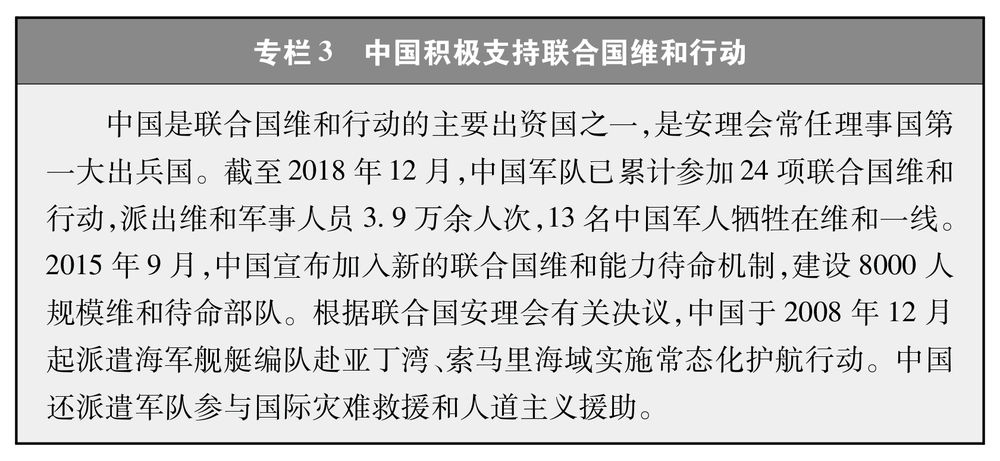 中國(guó)以實(shí)際行動(dòng)維護(hù)世界和平。70年來(lái),中國(guó)沒有主動(dòng)挑起過任何一場(chǎng)戰(zhàn)爭(zhēng)和沖突,沒有侵占過別國(guó)一寸土地。改革開放以來(lái),中國(guó)主動(dòng)裁減軍隊(duì)員額400余萬(wàn)。中國(guó)積極參與國(guó)際軍控、裁軍和防擴(kuò)散進(jìn)程,反對(duì)軍備競(jìng)賽,維護(hù)全球戰(zhàn)略平衡與穩(wěn)定。中國(guó)簽署或加入《不擴(kuò)散核武器條約》等20個(gè)多邊軍控、裁軍和防擴(kuò)散條約。中國(guó)已成為聯(lián)合國(guó)第二大維和預(yù)算攤款國(guó)和經(jīng)常性預(yù)算會(huì)費(fèi)國(guó),是安理會(huì)常任理事國(guó)第一大出兵國(guó)(專欄3)。2015年起,中國(guó)宣布設(shè)立為期10年、總額10億美元的中國(guó)-聯(lián)合國(guó)和平與發(fā)展基金,并于2016年正式投入運(yùn)行。中國(guó)始終致力于通過談判、協(xié)商方式處理領(lǐng)土問題和海洋劃界爭(zhēng)端,同14個(gè)鄰國(guó)中的12個(gè)國(guó)家徹底解決了陸地邊界問題,劃定了中越北部灣海上界線,為和平解決國(guó)家間歷史遺留問題以及國(guó)際爭(zhēng)端開辟了嶄新道路。中國(guó)積極參與重大國(guó)際和地區(qū)熱點(diǎn)問題解決,發(fā)揮了建設(shè)性作用。