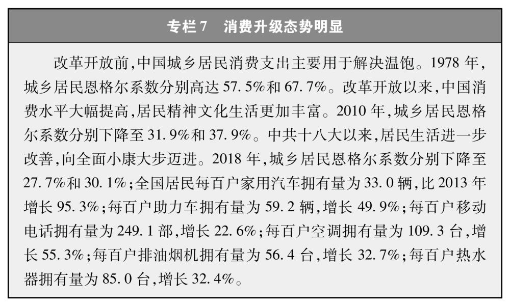 中國(guó)有世界上最具潛力的消費(fèi)市場(chǎng)。中國(guó)既是“世界工廠”,也是“全球市場(chǎng)”。中國(guó)有近14億人口、4億中等收入群體,市場(chǎng)規(guī)模全球最大。中國(guó)經(jīng)濟(jì)持續(xù)健康發(fā)展,帶來(lái)多個(gè)領(lǐng)域的廣泛需求,為經(jīng)濟(jì)發(fā)展提供重要引擎。中國(guó)消費(fèi)空間和潛力巨大,消費(fèi)升級(jí)態(tài)勢(shì)明顯,消費(fèi)增速超過固定資產(chǎn)投資,消費(fèi)梯度效應(yīng)凸顯,消費(fèi)對(duì)經(jīng)濟(jì)貢獻(xiàn)越來(lái)越大(專欄7)。麥肯錫全球研究院發(fā)布報(bào)告認(rèn)為,在汽車、酒類、手機(jī)等許多品類中,中國(guó)都是全球第一大市場(chǎng),消費(fèi)額約占全球消費(fèi)總額的30%。(注5)龐大的消費(fèi)需求為世界各國(guó)提供了巨大市場(chǎng)。未來(lái)15年,中國(guó)進(jìn)口商品和服務(wù)將分別超過30萬(wàn)億美元和10萬(wàn)億美元。