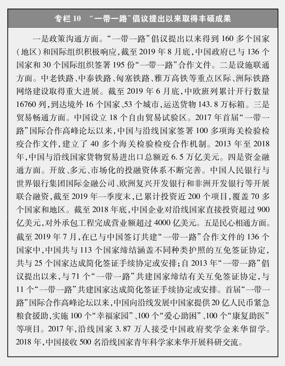 推動(dòng)高質(zhì)量共建“一帶一路”。共建“一帶一路”倡議以共商共建共享為原則,以和平合作、開放包容、互學(xué)互鑒、互利共贏的絲綢之路精神為指引,以政策溝通、設(shè)施聯(lián)通、貿(mào)易暢通、資金融通、民心相通為重點(diǎn),已經(jīng)從理念轉(zhuǎn)化為行動(dòng),從愿景轉(zhuǎn)化為現(xiàn)實(shí),從倡議轉(zhuǎn)化為全球廣受歡迎的公共產(chǎn)品(專欄10)。2016年11月聯(lián)合國(guó)通過決議,歡迎共建“一帶一路”等經(jīng)濟(jì)合作倡議。2017年3月,聯(lián)合國(guó)安理會(huì)決議中呼吁各國(guó)推進(jìn)“一帶一路”建設(shè),構(gòu)建人類命運(yùn)共同體。“一帶一路”倡議源于中國(guó),機(jī)會(huì)和成果屬于世界。據(jù)世界銀行研究報(bào)告,“一帶一路”倡議將使相關(guān)國(guó)家760萬(wàn)人擺脫極端貧困、3200萬(wàn)擺脫中度貧困,將使參與國(guó)貿(mào)易增長(zhǎng)2.8%至9.7%、全球貿(mào)易增長(zhǎng)1.7%至6.2%、全球收入增加0.7%至2.9%。(注8)“一帶一路”倡議是名副其實(shí)的資源共享、共同繁榮、共同發(fā)展之路。