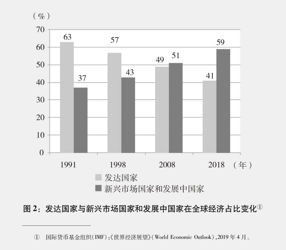 ↑圖表:圖2:發(fā)達(dá)國(guó)家與新興市場(chǎng)國(guó)家和發(fā)展中國(guó)家在全球經(jīng)濟(jì)占比變化① 新華社發(fā)