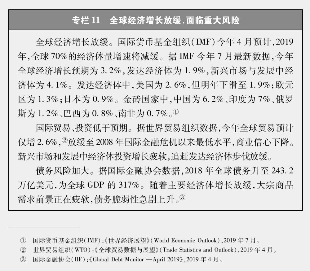 大變局充滿風(fēng)險(xiǎn)和挑戰(zhàn)。大變局深刻復(fù)雜、變亂交織,各種新舊因素、力量、矛盾相互疊加碰撞,大國(guó)關(guān)系、國(guó)際秩序、地區(qū)安全、社會(huì)思潮、全球治理深刻重塑,國(guó)際局勢(shì)不穩(wěn)定性不確定性日益突出,治理赤字、信任赤字、和平赤字、發(fā)展赤字越來(lái)越大,世界面臨重新陷入分裂甚至對(duì)抗的風(fēng)險(xiǎn)。全球經(jīng)濟(jì)增長(zhǎng)動(dòng)能不足、增速放緩,資本過度逐利導(dǎo)致貧富分化持續(xù)加大,貿(mào)易保護(hù)主義愈演愈烈,全球公共和私人債務(wù)高企,部分新興經(jīng)濟(jì)體出現(xiàn)較大金融動(dòng)蕩,全球經(jīng)濟(jì)下行壓力增大(專欄11)。國(guó)際安全形勢(shì)嚴(yán)峻復(fù)雜,國(guó)際戰(zhàn)略競(jìng)爭(zhēng)日趨激烈,地區(qū)安全局勢(shì)持續(xù)緊張,大規(guī)模殺傷性武器擴(kuò)散、恐怖主義、網(wǎng)絡(luò)攻擊、氣候變化、生物安全、有組織犯罪、重大傳染性疾病等傳統(tǒng)和非傳統(tǒng)安全問題相互聯(lián)動(dòng),嚴(yán)重威脅全球和地區(qū)安全。圍堵遏制、對(duì)抗威脅的冷戰(zhàn)思維沉渣泛起,霸權(quán)主義、強(qiáng)權(quán)政治甚囂塵上,叢林法則、零和博弈找到新的土壤,嚴(yán)重侵蝕動(dòng)搖戰(zhàn)后國(guó)際秩序基礎(chǔ)。一些西方國(guó)家治理陷入困境,民粹主義泛濫,逆全球化加劇。國(guó)際軍控和裁軍遭遇挫折,軍備競(jìng)賽趨勢(shì)顯現(xiàn),戰(zhàn)略平衡與穩(wěn)定受到破壞,一些地區(qū)熱點(diǎn)問題矛盾持續(xù)激化、對(duì)抗不斷升級(jí),戰(zhàn)爭(zhēng)幽靈若隱若現(xiàn)。信息化智能化迅猛發(fā)展,對(duì)人類生命的存在形式、活動(dòng)方式、倫理道德等提出了不可忽視的挑戰(zhàn)。