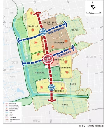 結(jié)合城鎮(zhèn)公共活動(dòng)中心,形成 3 大景觀核心,分別為閔東綜合服務(wù)中心、漕河涇科技創(chuàng)新中心、魯匯體育宜居中心。