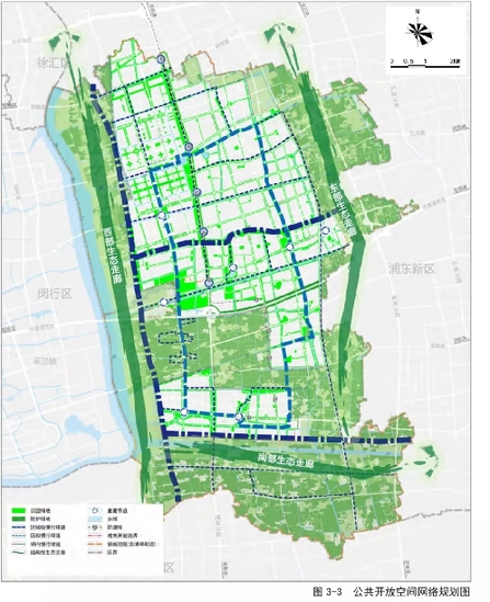 規(guī)劃以浦江郊野公園、浦閔郊野公園兩大片區(qū)為生態(tài)綠心,以西、南、東三大生態(tài)帶為結(jié)構(gòu)要素,向鎮(zhèn)域內(nèi)部延伸,通過(guò)濱水、沿路的綠道串聯(lián)次級(jí)公共活動(dòng)節(jié)點(diǎn), 形成層級(jí)分明、覆蓋完善的公共開放空間網(wǎng)絡(luò)。