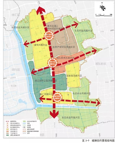 浦星公路城鎮(zhèn)發(fā)展帶:以浦星公路及軌道交通 8 號(hào)線為依托,形成集區(qū)域性綜合 商業(yè)、商務(wù)辦公、展示交易等服務(wù)功能為一體的城鎮(zhèn)服務(wù)和人口集聚的主軸。