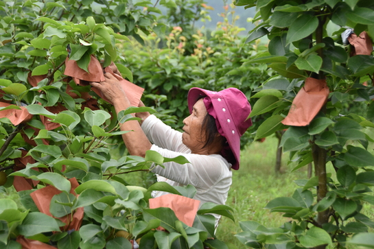 溆浦縣祖師殿鎮(zhèn)果農(nóng)在給梨樹套袋。記者 白田田 攝