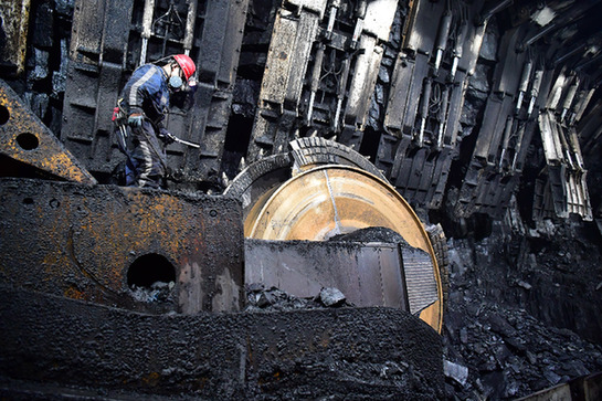 神東煤炭集團上灣煤礦12402綜采面內(nèi),工作人員對采煤機進行檢修。該煤礦新近投用了一批總重量超過萬噸的“鋼鐵巨獸”,用來“一口吞掉”以前需要多次分層開采的特厚煤層,使其在采煤工效、成本、生產(chǎn)能力、生產(chǎn)安全等方面躋身世界一流水準。神東煤炭集團是中國神華旗下核心煤炭生產(chǎn)企業(yè),由神東礦區(qū)四公司整合而來。記者 邵瑞 攝