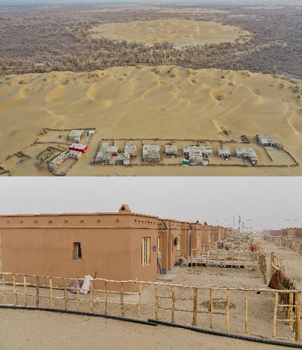 上圖是地處新疆塔克拉瑪干沙漠腹地的于田縣達(dá)里雅布依鄉(xiāng)的舊民居;下圖為新疆于田縣達(dá)里雅布依小鎮(zhèn)易地扶貧安置點(diǎn)的房屋。記者 胡虎虎 攝