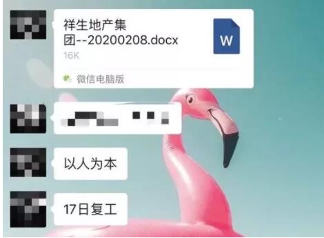 2月9日,臨近復(fù)工,位于新虹的祥生地產(chǎn)集團(tuán)在群里發(fā)了一則通知:正式復(fù)工時(shí)間為2月17日,延長(zhǎng)的這7天內(nèi),員工都自行在家隔離,居家云辦公期間,大家通過企業(yè)微信打卡自覺保證工作時(shí)間,確保相關(guān)工作正常跟進(jìn)完成。