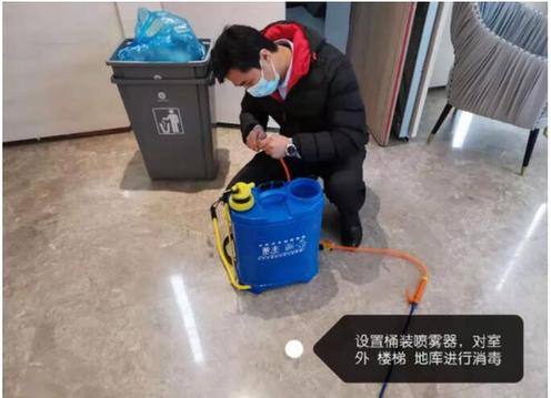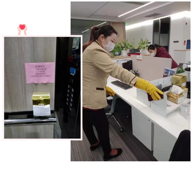 每天傍晚時(shí)分,保潔人員對(duì)整棟大樓,包括行政區(qū)域、公共區(qū)域、食堂進(jìn)行消毒,并在群里匯報(bào)。