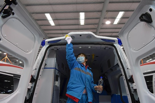 圖為工人在江鈴汽車集團改裝車股份有限公司負壓救護車生產(chǎn)基地爭分奪秒工作。近來,江西一批批企業(yè)排除萬難恢復(fù)生產(chǎn),開足馬力釋放產(chǎn)能,工人輪班作業(yè)日夜奮戰(zhàn),醫(yī)療物資被源源不斷運往抗疫一線。記者 彭昭之 攝