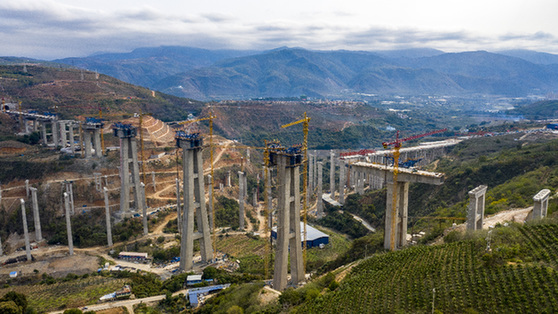 近期,中老鐵路玉溪至磨憨段有序復(fù)工復(fù)產(chǎn),由中鐵四局承建的中老鐵路全線重點控制性工程——元江特大橋、南溪河特大橋正在加緊施工建設(shè)。這是南溪河特大橋橫跨在建高速公路。記者 江文耀 攝